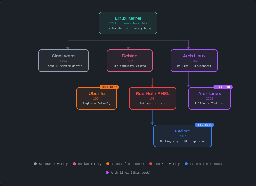 Linux isn’t one thing — it’s a family of operating systems all sharing the same kernel. Here’s how the three distributions in this book fit into the broader Linux world.